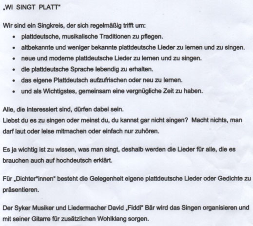10. Dezember 2025 „Wi singt Platt“ Mittwoch, 10. Dezember 2025 / 18:30 – 20:00 Uhr / Café Der offene Singkreis „Wi singt Platt“ mit David „Fiddi“ Bär trifft sich an jedem zweiten Mittwoch im Monat von 18:30 – 20:00 Uhr im Café. Es geht darum, plattdeutsche musikalische Tradition zu pflegen und gemeinsam eine vergnügliche Zeit zu haben. Das Motto: „Sünd all tohoop, denn singt wi mol ! Un singt een slecht, is schietegaal“. tagPlaceholderTags: veranstaltung Kommentar schreiben Kommentare: 0